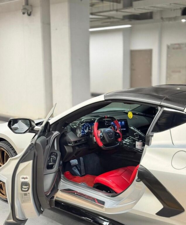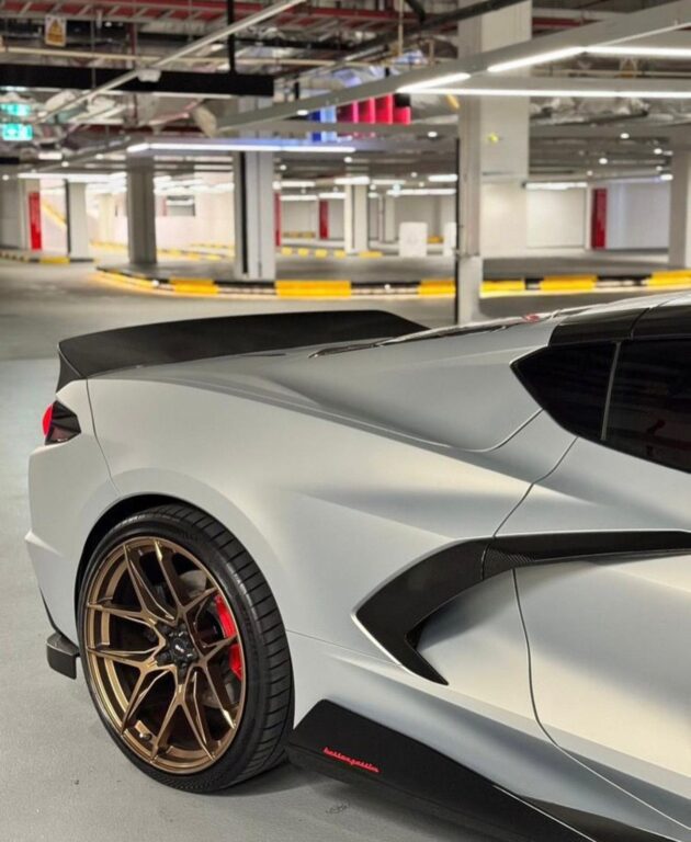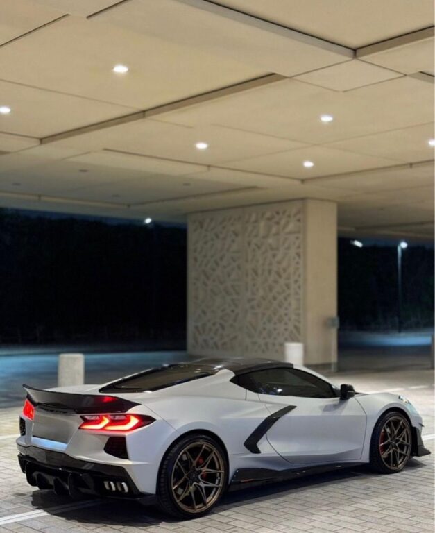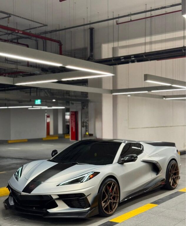 This exceptional C8 LT2 stands out with full matte body protection, a custom carbon fiber rear spoiler, and an additional removable roof for a sleek, sporty look. Upgraded with racing rims, while the original agency rims and tires are also included.